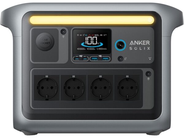 Anker Solix C1000 — потужна портативна зарядна станція з акумулятором 1056Wh та номінальною потужністю 1800W. Підходить для резервного живлення дому, зарядки побутових приладів та електроніки під час відключень електроенергії. Оснащена довговічною батареєю LiFePO4, підтримує швидку зарядку та підключення сонячних панелей.