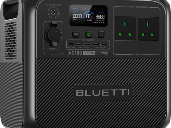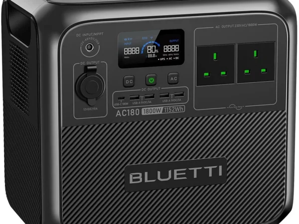 Bluetti AC180P — потужна портативна зарядна станція з акумулятором 1440Wh та номінальною потужністю 1800W. Підходить для резервного живлення будинку, використання під час відключень електроенергії, зарядки побутових приладів та електроніки. Оснащена довговічною батареєю LiFePO4 та підтримує швидку зарядку і підключення сонячних панелей.