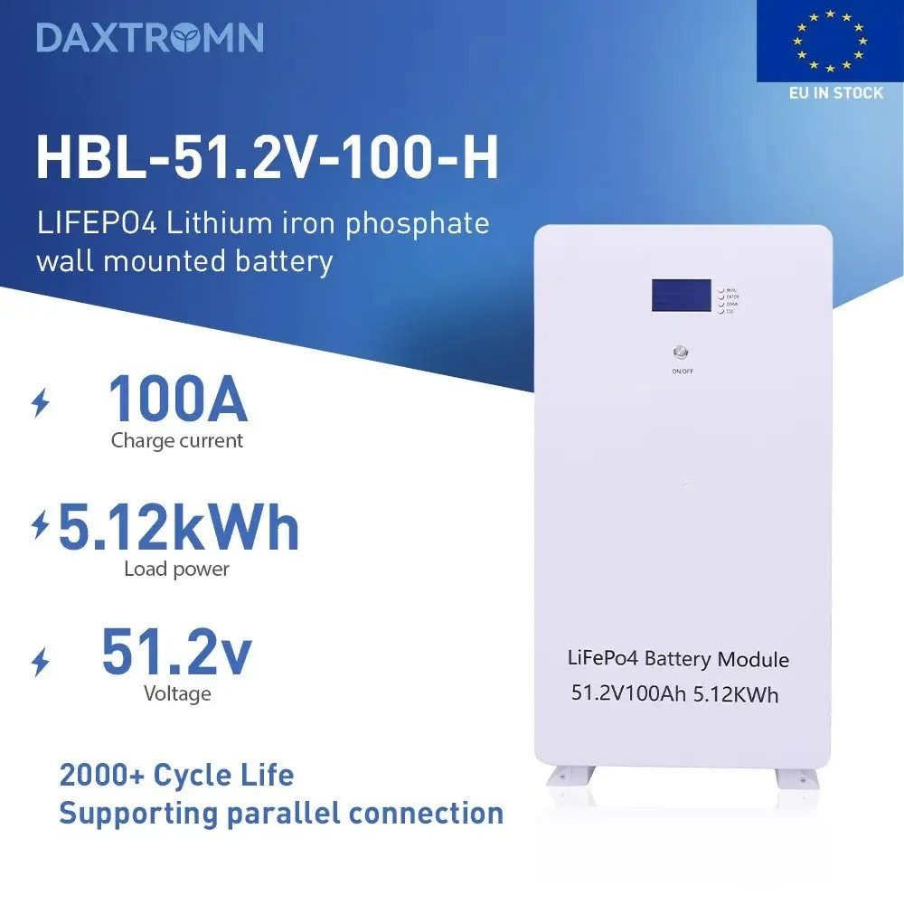 Акумулятор DAXTROMN виконаний на основі літій-залізо-фосфатної хімії (LiFePO4), яка відрізняється високою стабільністю, безпекою та тривалим ресурсом. Модуль має номінальну напругу 51,2 В (48-вольтовий клас), ємність 100 А·год і запас енергії 5,12 кВт·год. Вбудована система керування BMS контролює процеси заряду та розряду, забезпечуючи захист батареї під час експлуатації.