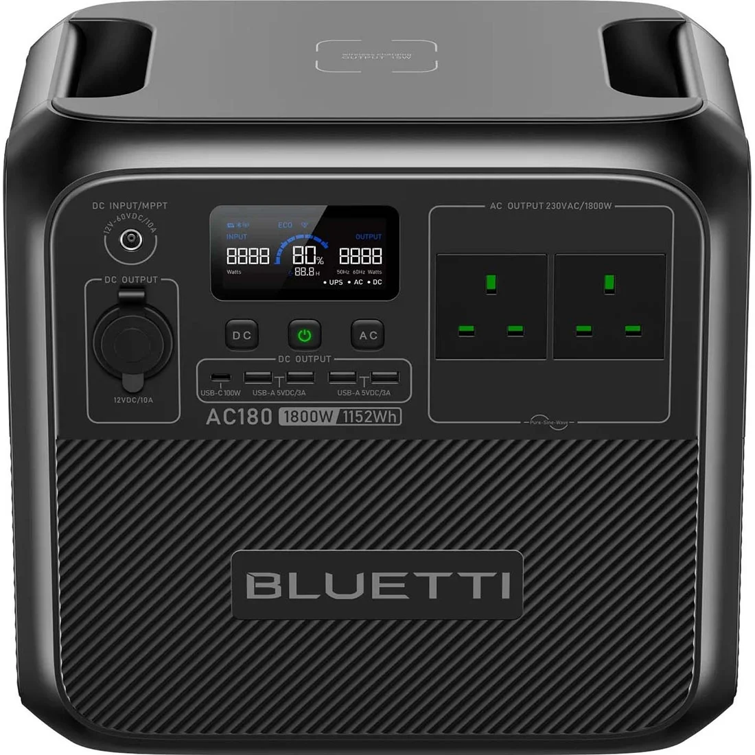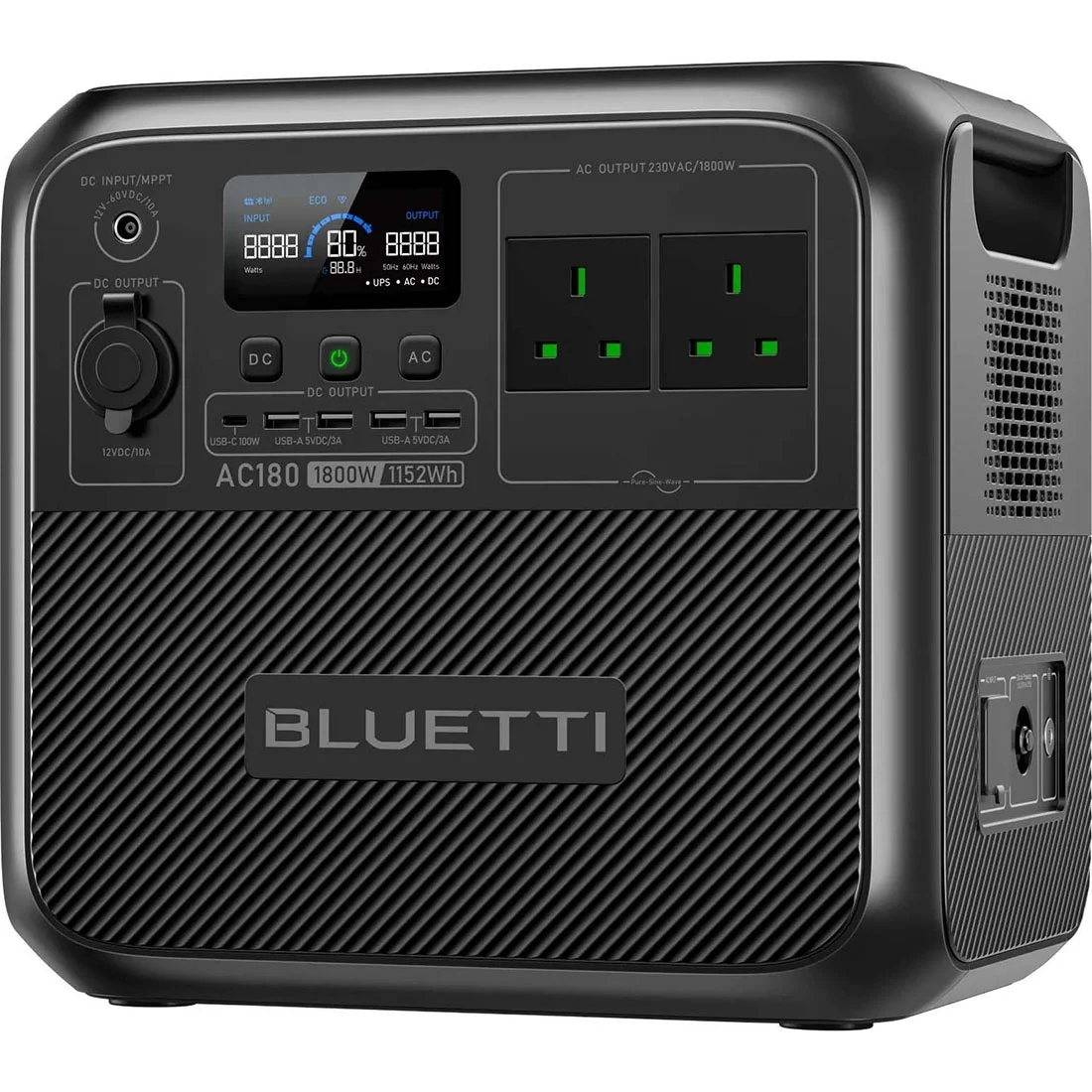 Bluetti AC180 — потужна портативна зарядна станція з ємністю акумулятора 1152Wh та номінальною потужністю 1800W. Ідеально підходить для резервного живлення під час відключень електроенергії, роботи з побутовою технікою, ноутбуками та іншими електроприладами. Оснащена довговічною батареєю LiFePO4, підтримує швидку зарядку та підключення сонячних панелей.