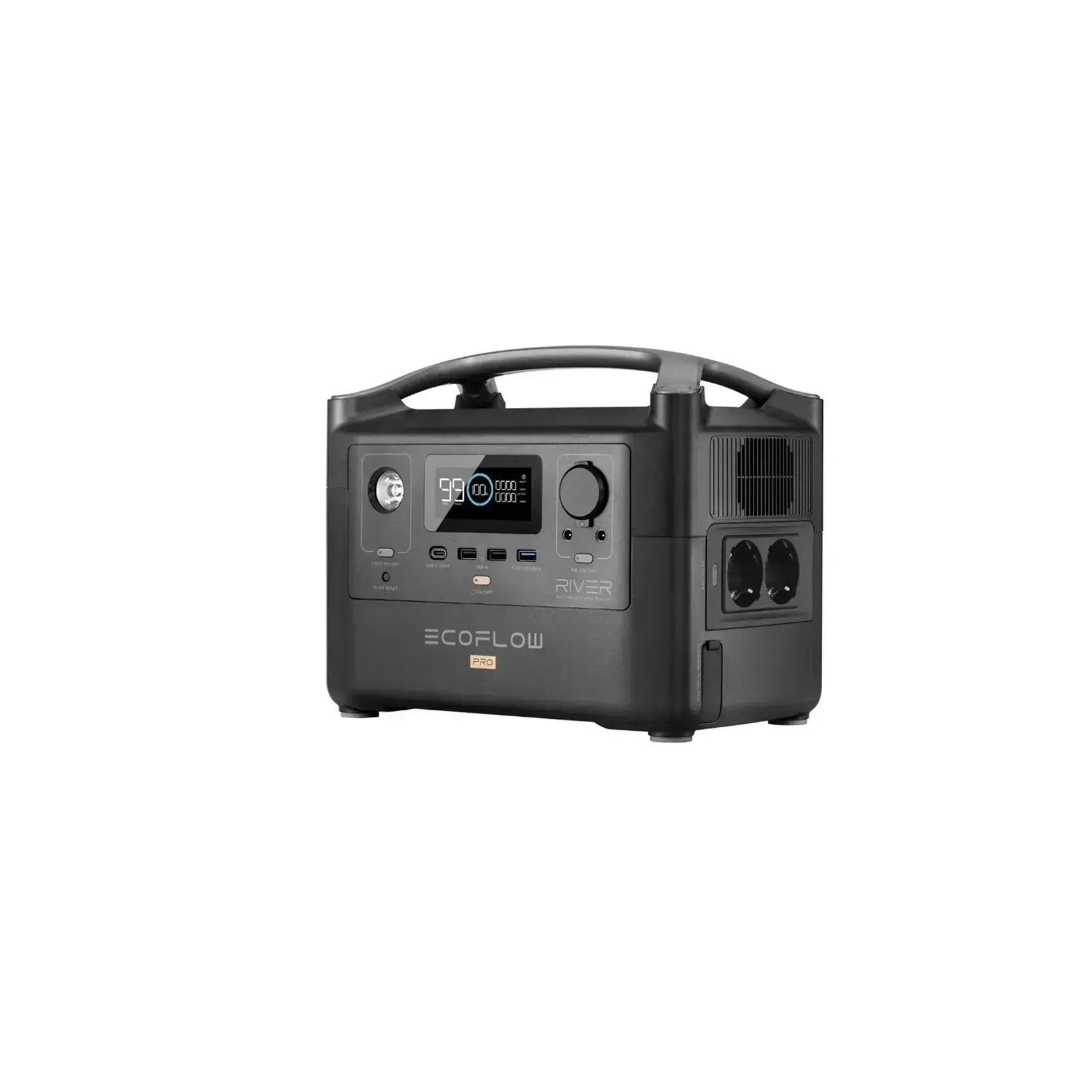 EcoFlow River Pro — портативна зарядна станція з акумулятором 720Wh та номінальною потужністю 600W. Підходить для резервного живлення під час відключень електроенергії, зарядки ноутбуків, смартфонів, роутерів та іншої електроніки. Підтримує швидку зарядку EcoFlow X-Stream та підключення сонячних панелей.